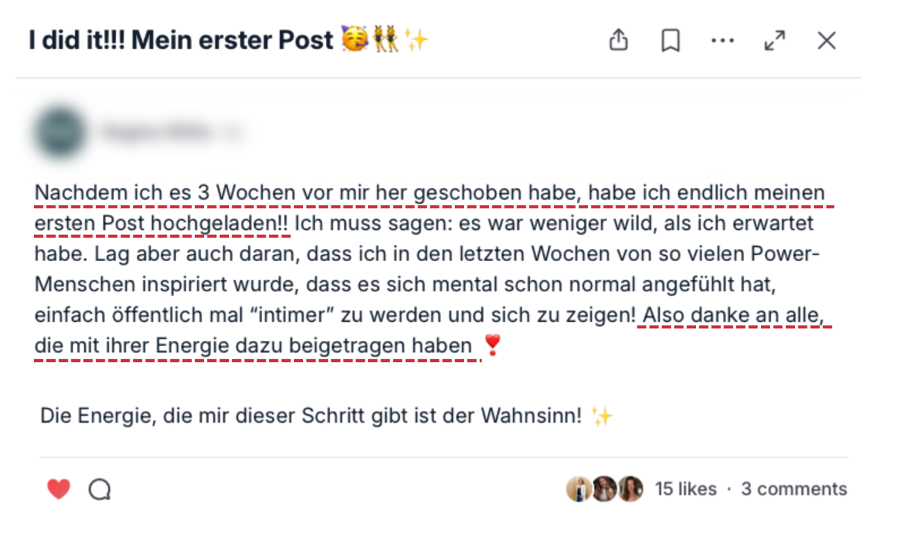 Menschen reden miteinander. Menschen helfen einander. Menschen halten einander accountable. Menschen wachsen zusammen. Das hier ist kein Programm. Das hier ist ein Umfeld, das dich trägt.